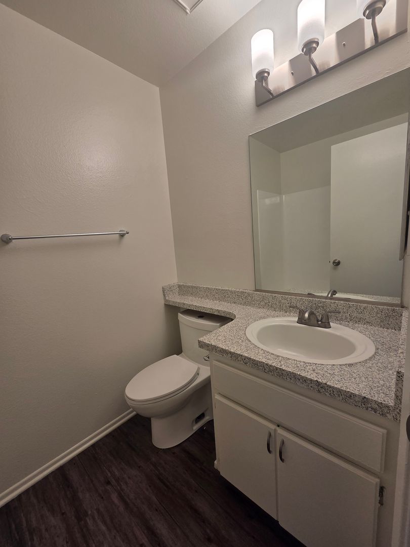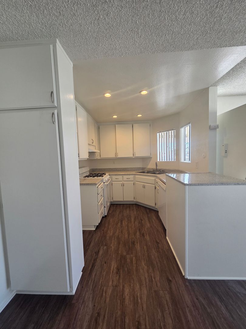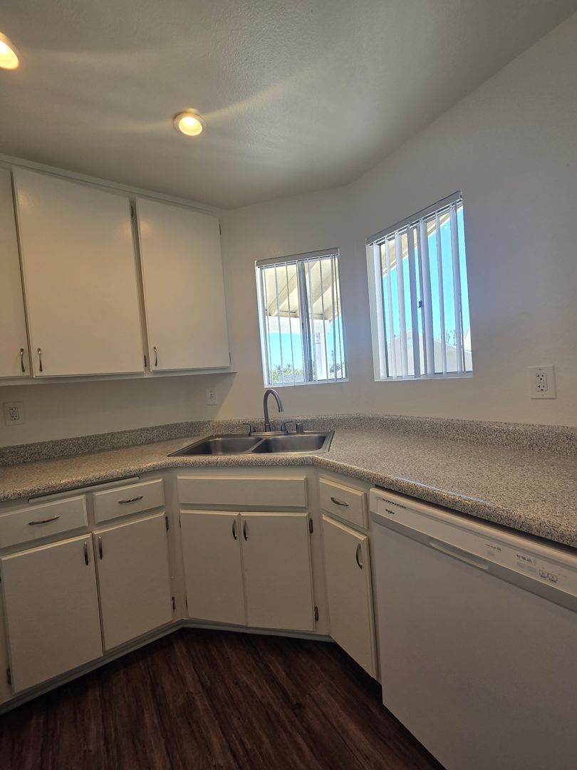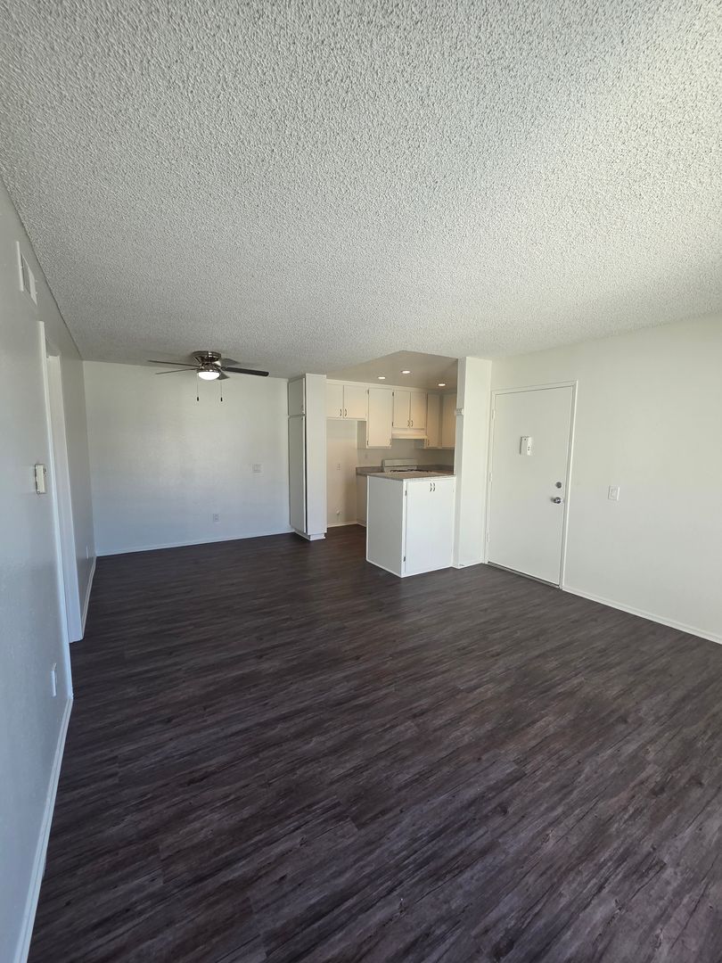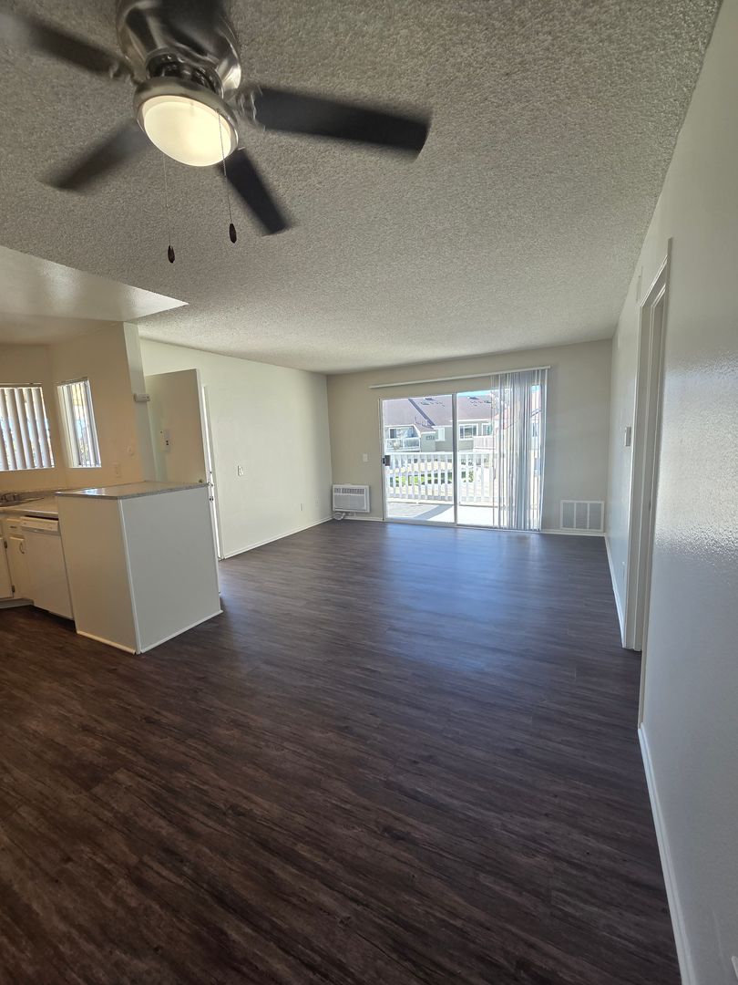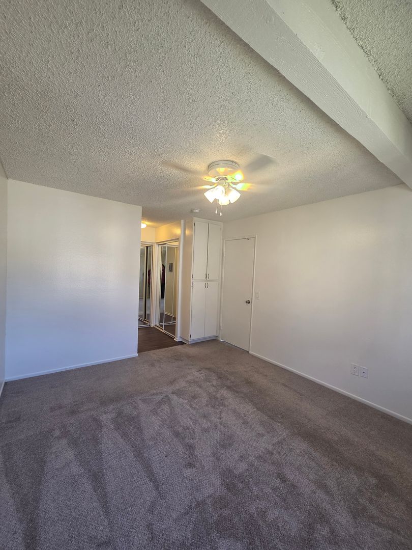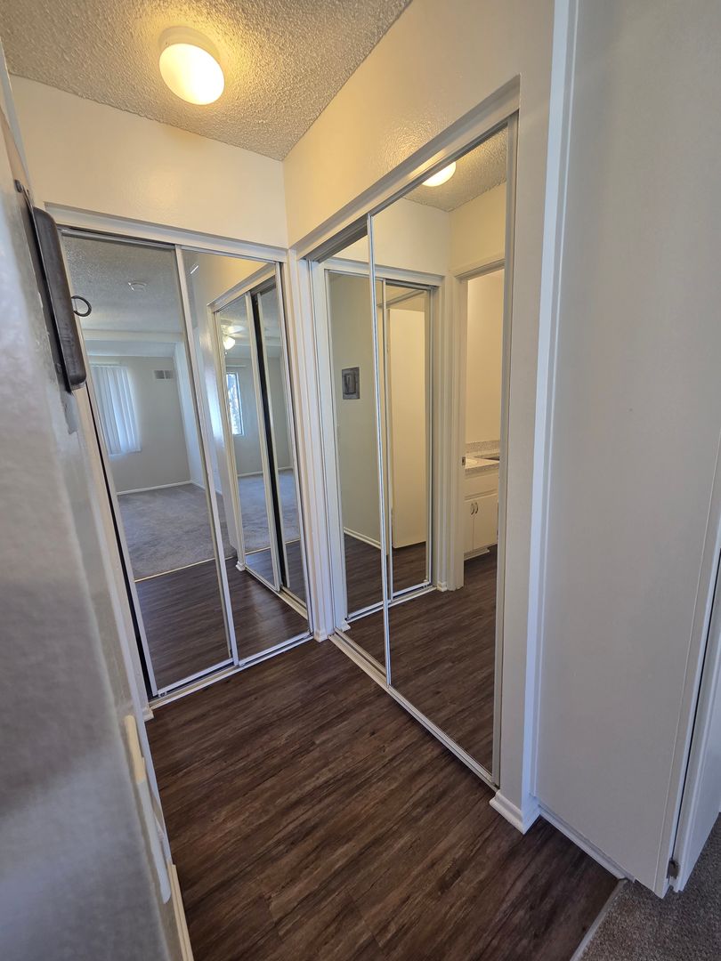 Welcome to Amberway Apartments in Anaheim! This upstairs 1 bedroom is one of the few remaining units priced at $2,000, don't miss out! This spacious unit offers vinyl plank flooring throughout with the exception of the carpeted bedroom. The kitchen boasts natural light, canned lighting for a modern touch, plenty of storage/pantry and counter space, dishwasher, and gas stove. Equipped with a newer model AC wall unit, central heating, and ceiling fans in both dining area and bedroom, comfort living is a breeze here. The mirrored closet doors also add a modern touch to the bedroom. The unit is conveniently located near 2 of our 5 on site laundry rooms and your covered parking is a few steps from your apartment.