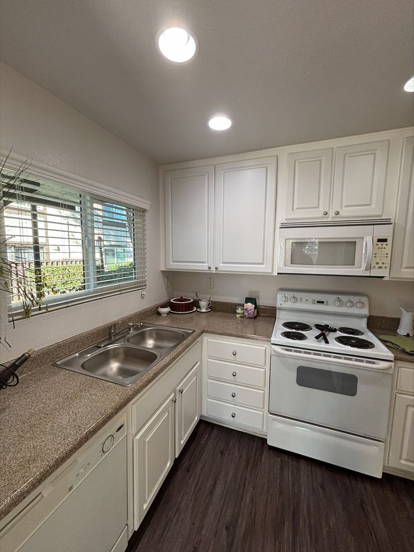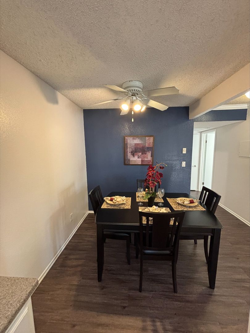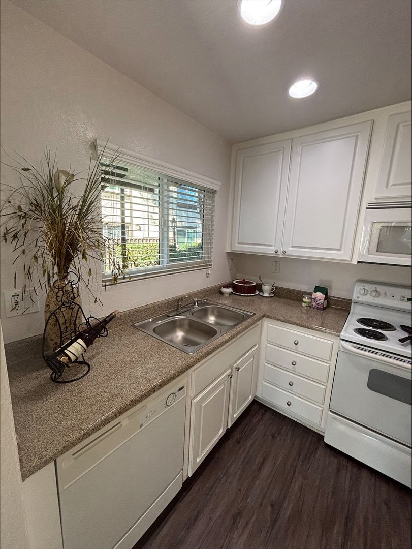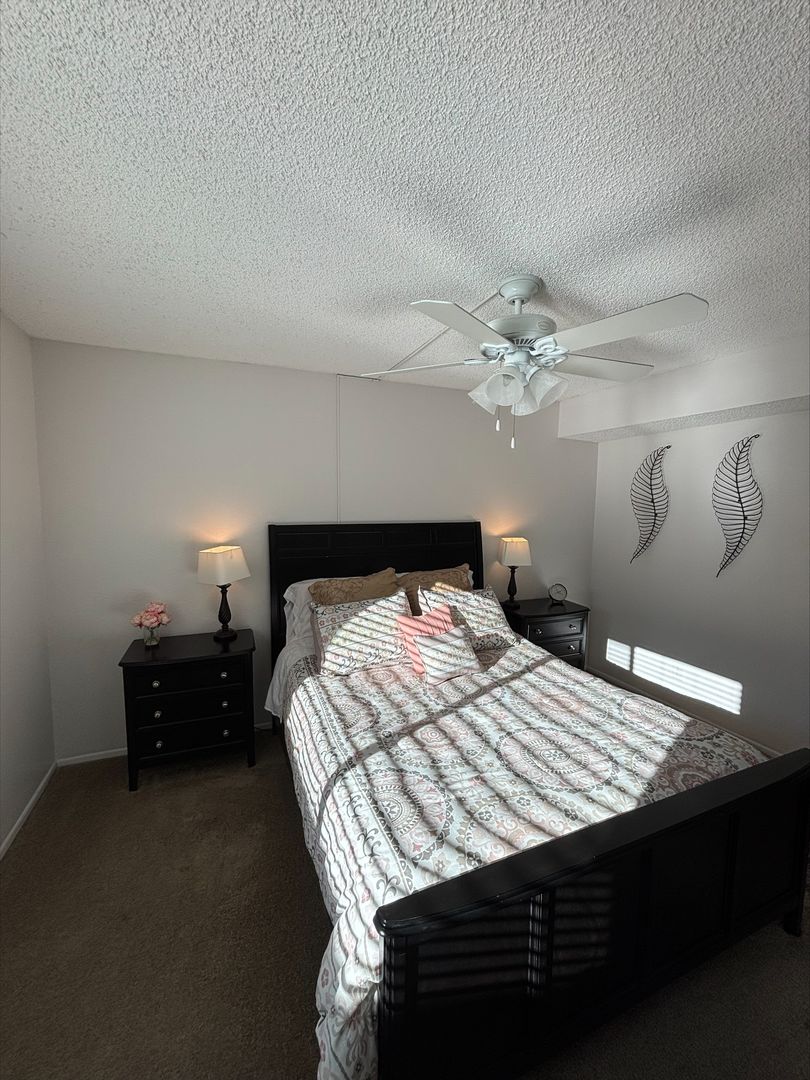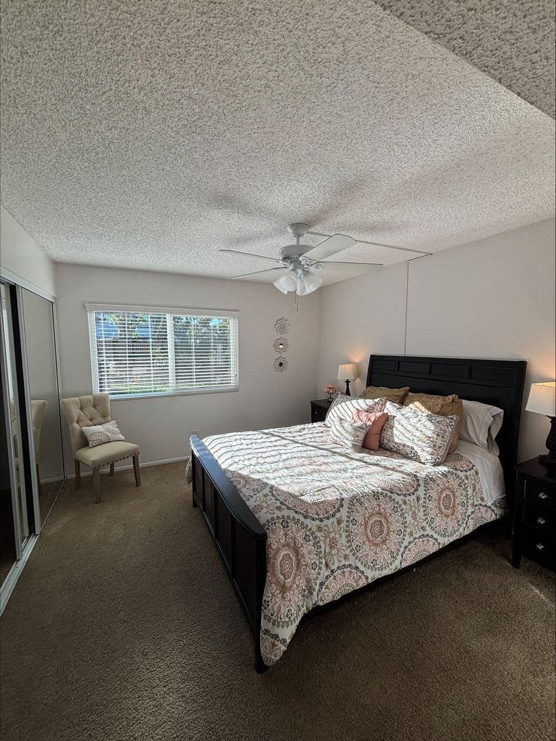 Welcome to your new home in Buena Park, CA! This spacious second-floor apartment offers two bedrooms and two bathrooms, perfect for those who value comfort and convenience. The unit comes with an in-unit washer and dryer, saving you time and trips to the laundromat. The kitchen is equipped with an electric stove, dishwasher, and recessed lighting, making meal prep a breeze. The vinyl plank flooring adds a touch of elegance to the space, while the carpet in the bedrooms provides a cozy feel. The large corner window in the living room lets in plenty of natural light, and the ceiling fans in the bedrooms and dining area ensure a comfortable atmosphere. The master bedroom features a walk-in closet, providing ample storage space. The apartment also includes a wall unit AC in the living room and central heating for your comfort.